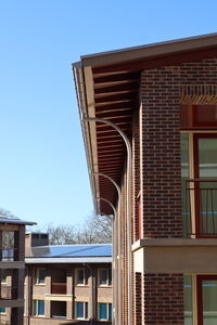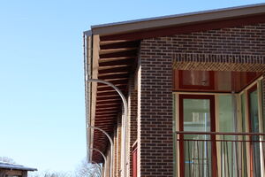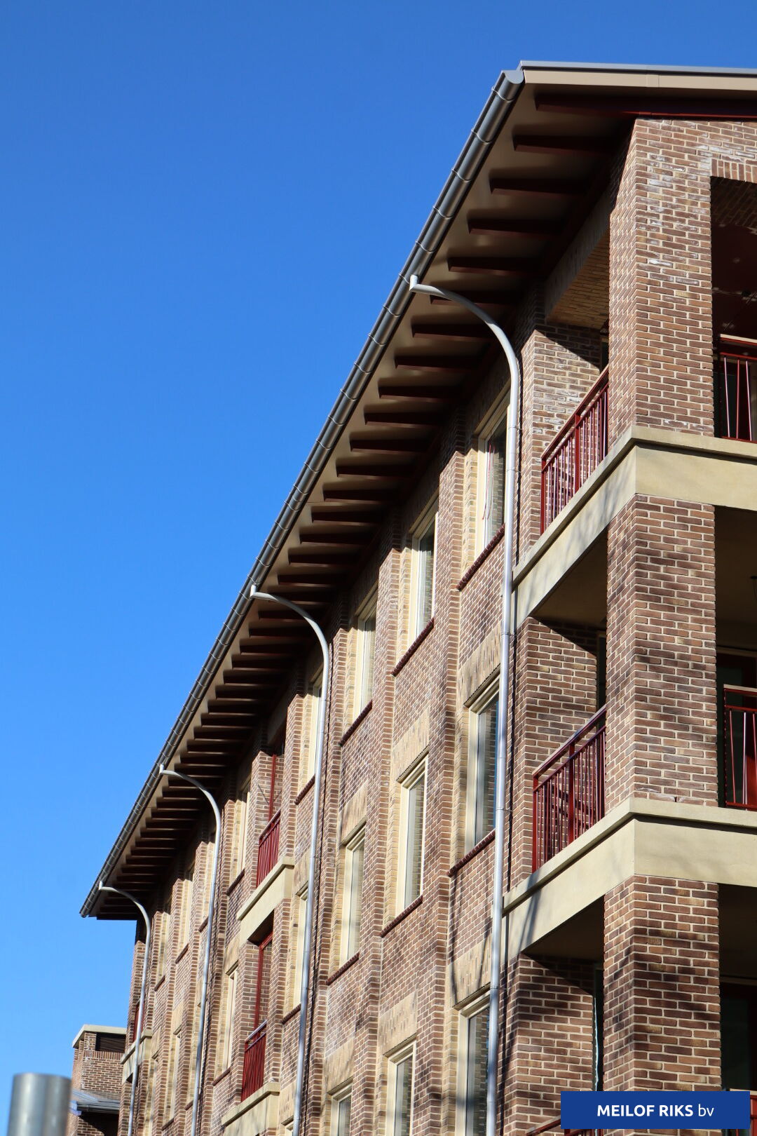 “We kwamen er al snel achter dat er veel mogelijk was”, vervolgt Beelen. “We dachten bijvoorbeeld dat alles in één kleur moest. De klossen, smetplanken en overstek kregen verschillende kleuren. Zo wek je de suggestie van gestapelde materialen, dus de aanblik van hout. De afwerking met aluminium mastgoten en hwa’s versterkt de traditionele look. Een heel mooi detail vind ik de vorm van de hwa’s om de brede dakoverstek te overbruggen. In deze hwa’s zit exact dezelfde ronding als in het gemetselde motief van een boog in Amsterdamse-Schoolstijl rond de ingang. De inbreng van Meilof Riks bv zorgde ervoor dat we dit project konden maken zoals we het voor ogen hadden. Zonder de aluminium bouwdelen van Meilof Riks bv was het niet gelukt om te creëren wat er nu staat.”